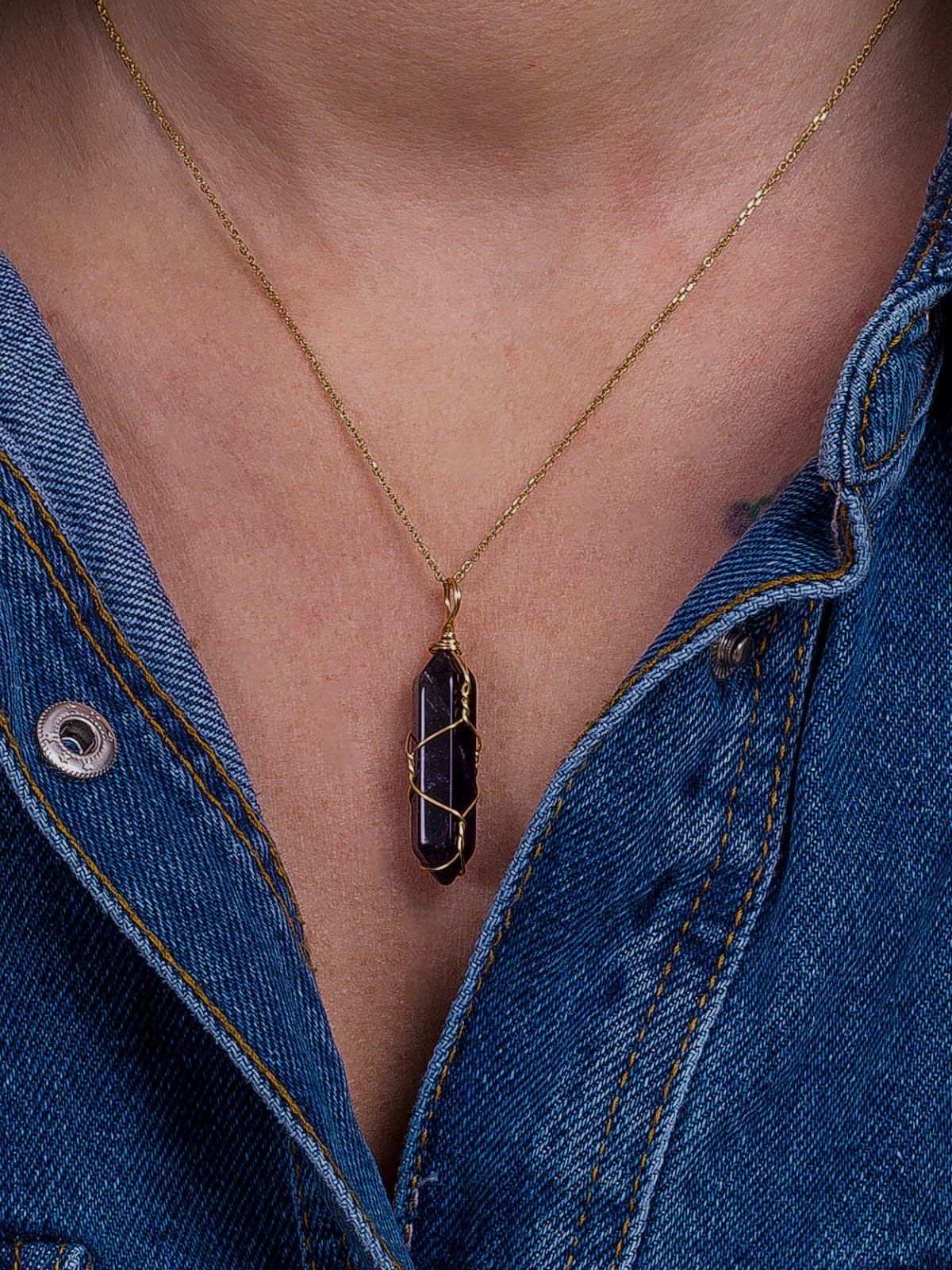 Pozłacany naszyjnik z ozdobnym fioletowym jadeitem to wyrazista, a jednocześnie elegancka biżuteria inspirowana naturą. Smukły kryształ w głębokim, fioletowym odcieniu został ręcznie opleciony dekoracyjnym drutem, który nadaje całości artystyczny i niepowtarzalny charakter.