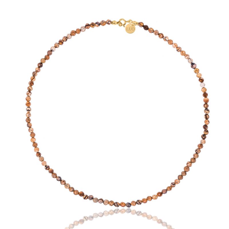 Naszyjnik z jaspisu obrazkowego z pozłacanym zapięciem. Kule fasetowane jaspisu obrazkowego są unikalne i każda kula różni się kolorem. Zapięcie i logo wykonane ze srebra próby 925 pokrytego 18 karatowym żółtym złotem.
