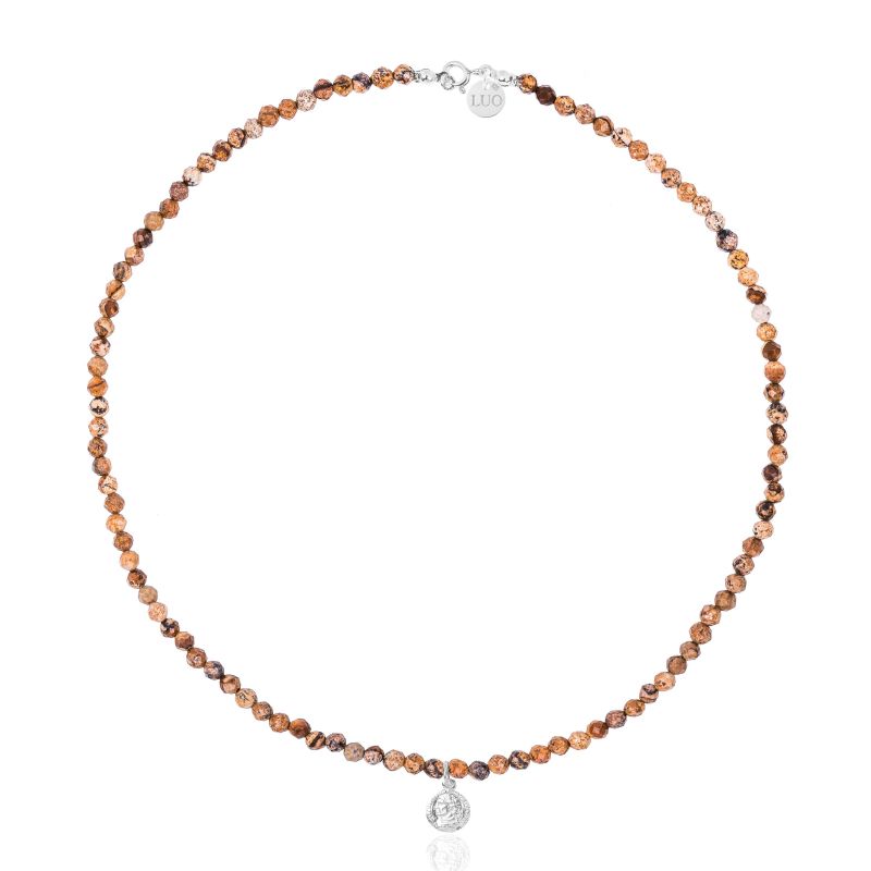 Naszyjnik z jaspisu obrazkowego ze srebrnym zapięciem i monetą. Kule fasetowane jaspisu obrazkowego są unikalne i każda kula różni się kolorem. Zawieszka, zapięcie i logo wykonane ze srebra próby 925.