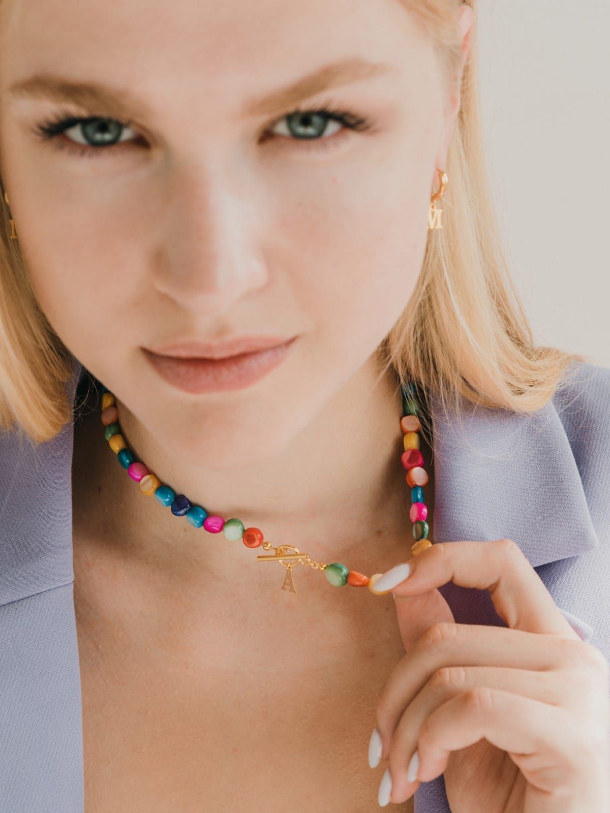 Naszyjnik z kolorowej masy perłowej z literką to porcja dobrej energii, którą zakładasz na szyję. Krążki masy perłowej układają się w barwny rytm (każdy egzemplarz ma swój własny układ kolorów), a detale z srebra 925 pozłacanego 18k dodają ciepłego blasku. Ozdobne zapięcie toggle i naszyjnik z literką tworzą personalny akcent, który natychmiast przyciąga wzrok. Do wyboru długości 40 / 45 / 50 cm – łatwo dopasujesz naszyjnik do dekoltu i warstw.