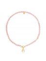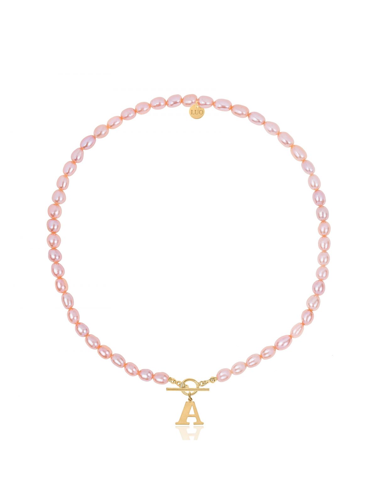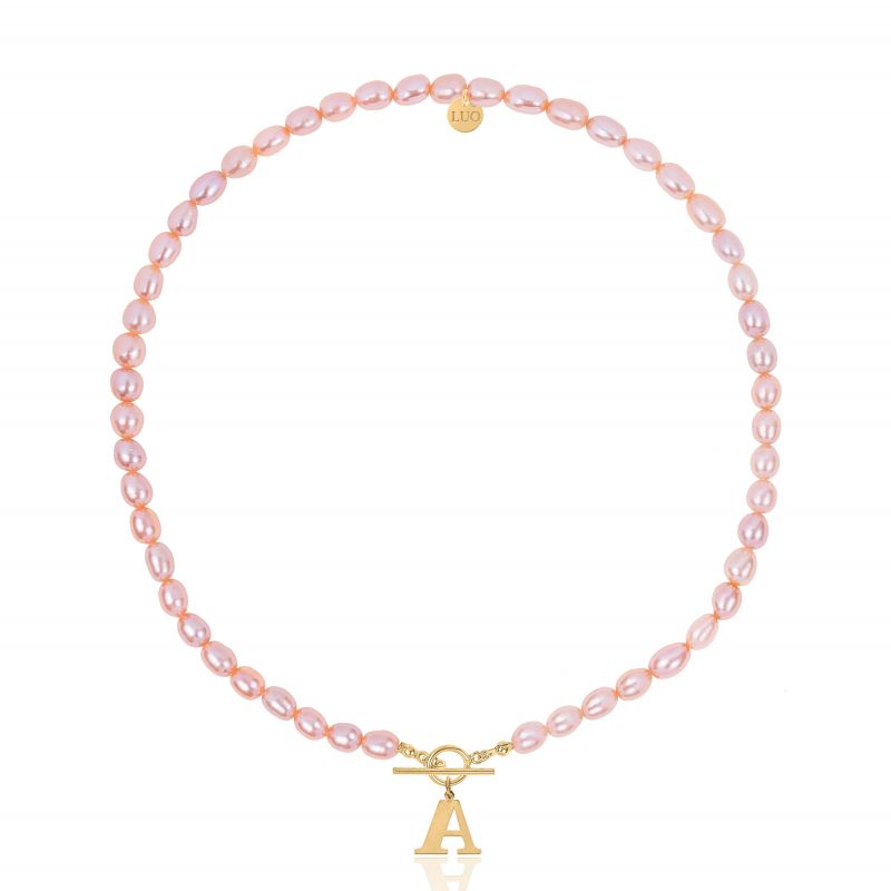 Naszyjnik z naturalnych różowych pereł z pozłacanym ozdobnym zapięciem i dużą literka. Całość wykonana z naturalnych hodowlanych pereł w kolorze różowym. Zawieszka, zapięcie i logo wykonane ze srebra próby 925 pokrytego 18 karatowym żółtym złotem.