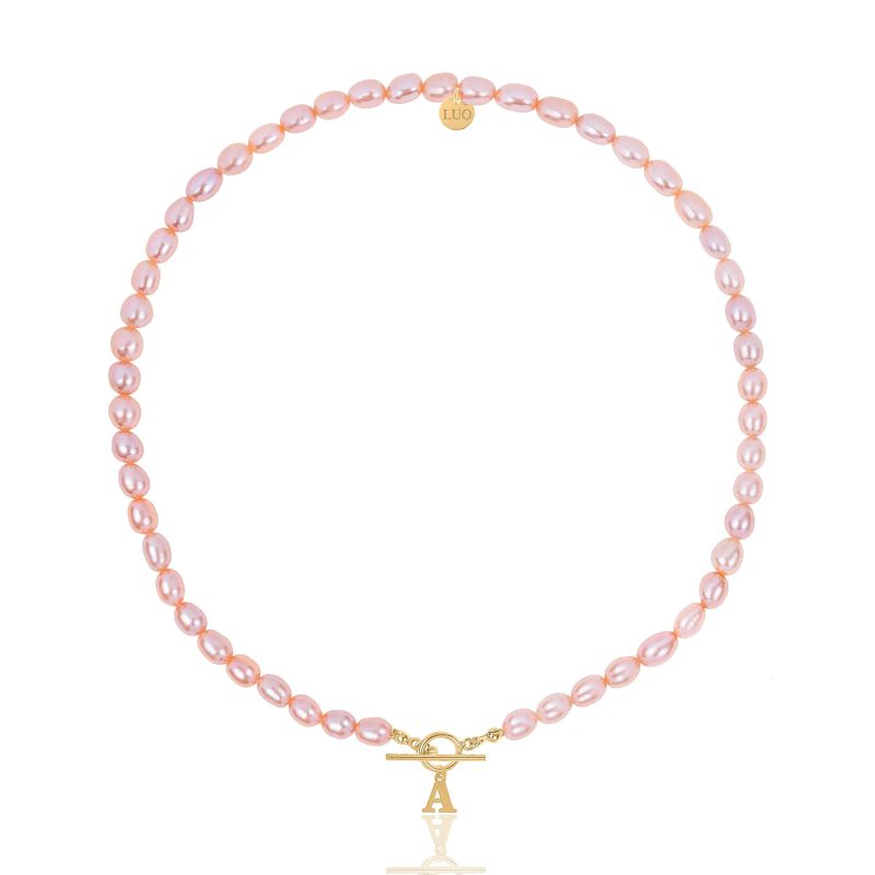 Naszyjnik z naturalnych różowych pereł z pozłacanym ozdobnym zapięciem i literka. Całość wykonana z naturalnych hodowlanych pereł w kolorze różowym. Zawieszka, zapięcie i logo wykonane ze srebra próby 925 pokrytego 18 karatowym żółtym złotem.